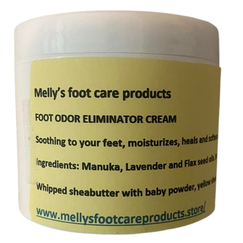 Eliminates foot Odor in its tract. The combination of mango butter, whipped shea butter with baby powder, yellow shea butter, Flax seed, Lavender and Manuka oils and a mild fragrance keeps your foot Odor under control.